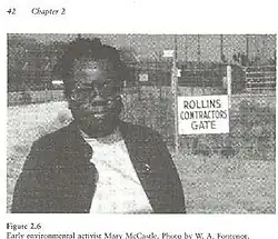 Although this was seen as a class action case, it was one of the first Environmental Justice Cases within the nation. The protests that occurred in Warren, North Carolina is often seen as the first environmental justice movement even though that protest started in 1982 and residents in Alsen began to take note of the negative health effects that Rollins Environmental Services in 1976.[13] At the time that protests began in Alsen, people within the community didn't have many examples of people of color leading these movements.[7] Mary McCastle would then prove to be a role model for African-American environmental activists in Louisiana years after the Rollins case was litigated and settled.[21] After the community settled with Rollins, McCastle used her money to travel to different parts in the south, speak in front of churches and schools, and help people gain awareness about the environmental harms that were occurring in their communities.[23]
