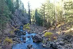 The McCloud River watershed drains 674 square miles (1,750 km2).[5] It rises from several spring-fed streams in Colby Meadows in the Cascades approximately 10 miles (16 km) southeast of Mount Shasta in Siskiyou County. It flows initially west, passing south of Mount Shasta and receiving streams that drain the southern slope of the peak. East of McCloud it forms a series of waterfalls which tumble over basaltic lava flows, known collectively as the McCloud River Falls or Falls of the McCloud River.
