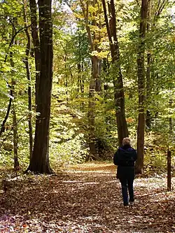 Much of the infrastructure of the park was built by the Civilian Conservation Corps during Franklin D. Roosevelt's New Deal era, and many of the CCC-built structures, retaining walls, and elegant, arched limestone bridges remain in use today. The park entrance gatehouse, former nature center, and a stone arch bridge over McCormick's Creek were listed on the National Register of Historic Places in 1993.[5] There are eight numbered hiking trails in the park, accessing features and park attractions, which include a 90-foot (27 m) fire tower, a scenic ravine and waterfall, small cave, sinkhole formations, and towering stands of second-growth Midwestern hardwoods. The park also features a fine system of equestrian paths.
