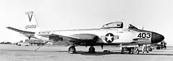 On 11 January 1947, the first prototype performed its maiden flight from Lambert Field, St. Louis, Missouri, piloted by McDonnell test pilot Robert M. Eldholm.[6] During this first test flight, the aircraft demonstrated a climb rate of 9,000 ft/min (2,700 m/min), twice that of the F8F Bearcat, the Navy's primary fleet defense interceptor.[7] The flight test programme, which included carrier trials, was considered to be a success, however, various improvements and refinements to the aircraft were suggested. The U.S. Navy also permitted McDonnell to borrow one of the prototypes to assist in the development of afterburners and to test fly a modified wing design with an extended trailing edge.[6]