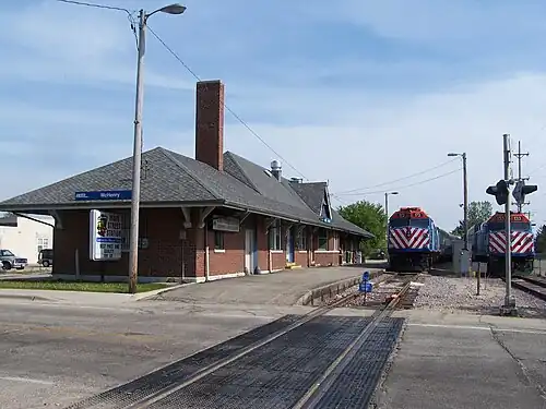 McHenry is a station on Metra's Union Pacific Northwest Line, located in McHenry, Illinois. The station is the terminus of the McHenry Branch of the Northwest Line; inbound trains operate as far as Ogilvie Transportation Center in Chicago. The station is also the only station on the McHenry Branch after it splits off at Pingree Road, although the line previously extended to Williams Bay, Wisconsin. Proposals exist to expand service on the line by adding stations in Prairie Grove and Johnsburg. It is the fifth furthest Metra Station from Chicago after Harvard, Antioch, Woodstock, and Kenosha, at 50.47 miles (81.22 km). Most Northwest Line trains operate along the Harvard branch to Harvard or Crystal Lake rather than the McHenry Branch. The station only has one track and one platform due to the low number of trains that serve the station. Two storage tracks are used to store two trains during overnight hours as well as weekends and holidays. The station is located at grade level. There is one grade crossing of a road at the station, which is placed under a Federal Railroad Administration horn quiet zone.[2] As of 2018, McHenry is the 198th busiest of the 236 non-downtown stations in the Metra system, with an average of 85 weekday boardings.[1]