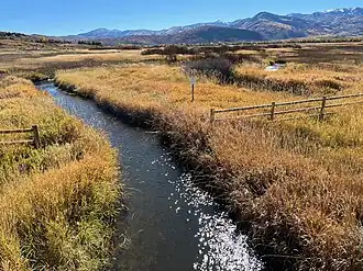 Silver Creek then passes further north through the Snyderville Basin[11] east of Snyderville, Utah, and then through Parleys Park[12] towards Interstate 80. Shortly after crossing north beneath I80, it is joined on the right by a smaller stream named Kimball Creek,[13] and this confluence forms the source of East Canyon Creek, a tributary of the Weber River, and ultimately, the Great Salt Lake.[14] Note the Geographic Names Information System (GNIS) likely needs to be corrected to be consistent with the U.S. Geological Survey report and map.