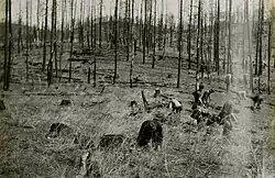 Shortly after the fire, the USFS, aided by the CCC, began planting ponderosa pine seedlings to replenish the burn scar. These seeds were gathered from elsewhere in Black Hills National Forest, as well as Harney National Forest. By January 1, 1940, 6,500 pounds (2,900 kg) of seeds had been planted across 4,000 acres (1,600 ha) in the burn scar area.[10] However, later testing revealed that the planted trees were of a subspecies not native to the area. Unlike the native Black Hills pines, the new ponderosas did not shed their dead branches, had stunted growth, and were more susceptible to disease.[11] Because the trees created a higher risk for forest fires, the USFS began forming plans in 2019 to remove the branches and eventually cut down the non-native species to replace them with native species.[2] Dubbed the Artemis Restoration Project, work began in 2022 to replant 8,000 to 10,000 acres (3,200 to 4,000 ha) of forest.[3]