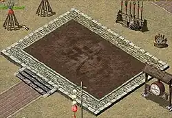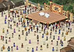 • Another game with a lei tai is “吞食天地 ONLINE” (Swallow Heaven and Earth Online). The original arcade version was better known as Dynasty Wars.[13] The Chinese character on the large backdrop is also Wu (武).