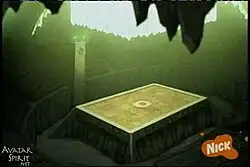 • In “The Blind Bandit” episode of Avatar: The Last Airbender, Aang’s quest for an Earthbending teacher finds him watching “Earth Rumble VI”, a competition (and parody of Professional wrestling) between various earthbenders vying for the Championship belt. Instead of a ring, the competition is fought on a very large stone lei tai. Prior to the first round, the announcer, Xin Fu, explains the rules to the fighters, “The rules are simple. Just knock the other guy out of the ring and you win.” Aang wins the competition by knocking the “Blind Bandit” (Toph, a blind 12-year-old girl), the current champion, off of the lei tai with a huge gust of wind.[14]