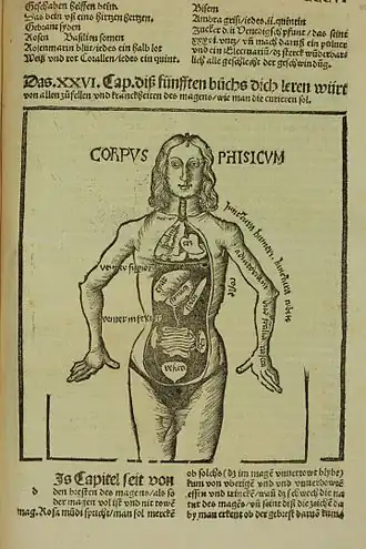 Hildegard of Bingen was an example of a medieval medical practitioner who, while educated in classical Greek medicine, also utilized folk medicine remedies.[12] Her understanding of the plant based medicines informed her commentary on the humors of the body and the remedies she described in her medical text Causae et curae were influenced by her familiarity with folk treatments of disease. In the rural society of Hildegard's time, much of the medical care was provided by women, along with their other domestic duties. Kitchens were stocked with herbs and other substances required in folk remedies for many ailments.[11] Causae et curae illustrated a view of symbiosis of the body and nature, that the understanding of nature could inform medical treatment of the body. However, Hildegard maintained the belief that the root of disease was a compromised relationship between a person and God.[11] Many parallels between pagan and Christian ideas about disease existed during the early Middle Ages. Christian views of disease differed from those held by pagans because of a fundamental difference in belief: Christians' belief in a personal relationship with God greatly influenced their views on medicine.[13]