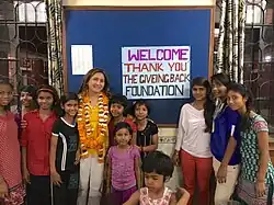 Gandhi is the founder and CEO of The Giving Back Foundation, a foundation geared towards alleviating illness, poverty and suffering while also addressing education issues which affect women and children around the world. Through her Foundation, Gandhi devotes her life to charity and help for those in need, notably abused and hungry children, widows, the sick, the deaf and blind. She is particularly interested in education as the stepping stone to success.[4] Gandhi has supported charities with strong female leadership programs and workshops, in part because of the role models in her life: Hillary Clinton, Cherie Blair, and Gandhi's own mother, an Irish woman living in India. These charities include the Cherie Blair Foundation for Women in the United Kingdom and the Eleanor Roosevelt Leadership Center in the United States.[5]