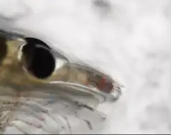 Similar to all krill species, northern krill are crustaceans that possess a transparent chitinous exoskeleton. Northern krill can grow up to 4-6 centimeters long in adult hood, although on average they are 1.5–2 centimeters.[3] Their anatomy is a decapod consisting of three main sections: the cephalothorax, the abdomen, and the tail fan. The cephalothorax is the krill's head which houses two antenna and compound eyes. Northern krill utilize their antenna to sense their surroundings and aiding in eating feed. In addition to the northern krill's antenna they also have maxillipeds which aid them in handling food to their mandible.[4] Found in insects, krill also operate through compound eyes which allows them to see a large array of area, detect rapid movement, and see in deep sea light conditions.[5] Northern krill also possess mandibles and maxillipeds which aid them in eating
