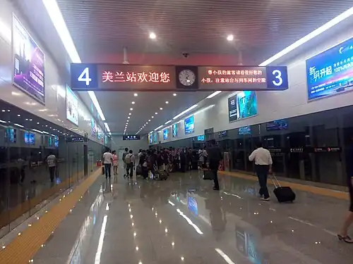 Meilan railway station (Chinese: 美兰站) is a railway station on the Hainan eastern ring high-speed railway located in Hainan, People's Republic of China. It is connected to the Haikou Meilan International Airport, which is the main airport of the Hainan island, and one of the busiest in China. Hence, travellers typically land in the Haikou Meilan International Airport, and then reach their final destination on the Hainan island using the railway.
