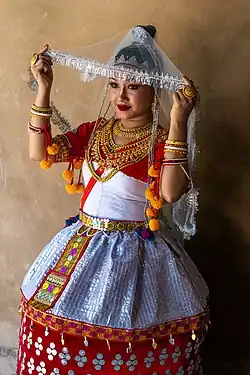 A Meitei bride wears a potloi, a special marriage dress with red applique designs on the border. She wears a short-sleeved shirt and is covered with a thin white cloth. Kajenglei, a traditional Meitei headdress, is placed on her head.[1]