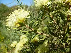 Melaleuca ciliosa is a small shrub in the myrtle family, Myrtaceae and is endemic to the south-west of Western Australia. It has bright or pale yellow flowers, an unusual calyx and leaves that are slightly hairy, especially around the edges.