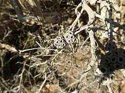 The flowers are arranged in almost spherical heads up to 23 mm (0.9 in) in diameter. The heads are on the ends of branches which continue to grow after flowering, and often also in upper leaf axils. Each head contains 6 to 13 groups of flowers in threes. The petals are 1.7–2.5 mm (0.07–0.1 in) long and fall off as the flower opens. The stamens are purple, pink or mauve with golden tips and are arranged in five bundles around the flower, each bundle containing 7 to 11 stamens. Flowering occurs in late spring to summer and the fruit that follow are woody capsules in tight, almost spherical clusters up to 14 mm (0.6 in) in diameter appearing like miniature footballs.[3][4][5]
