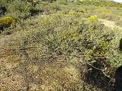Melaleuca filifolia is usually a small, spreading shrub to 2 m (7 ft) high, sometimes to 4 m (10 ft). The leaves are arranged alternately on the stem, are circular in cross-section,10–35 mm (0.4–1 in) long and 2–4 mm (0.08–0.2 in) wide.