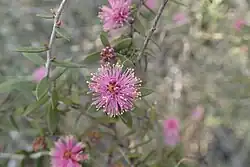 Melaleuca polycephala is a shrub in the myrtle family, Myrtaceae, and is endemic to the south-west of Western Australia. It is a sparsely foliaged, twiggy shrub with deep purple flowers in spring.