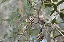 The flowers are arranged in heads on the ends of branches which continue to grow after flowering. The heads contain between 3 and 7 groups of flowers in threes and are up to 12 mm (0.5 in) in diameter. The stamens are in five bundles around the flowers, each bundle containing 3 stamens. Flowering is mainly in September and October and is followed by fruit which are woody capsules 2.0–2.8 mm (0.08–0.1 in) long and in roughly spherical clusters.[2][3]