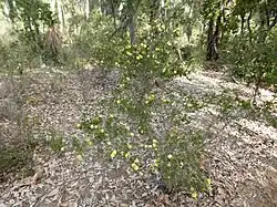 The flowers are bright yellow, and arranged in a spike or a head near the ends of branches. The heads are up to 15 mm (0.6 in) in diameter and contain 2 to 15 groups of flowers in threes. The stamens are arranged in five bundles around the flower, each bundle with 7 to 11 stamens. Flowering occurs from August to February but mainly in October and November. The fruit which follow are woody capsules 2.3–4 mm (0.09–0.2 in) long in clusters of about six which are about 10 mm (0.4 in) in diameter. The rim of the fruit are flat.[2][3]