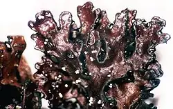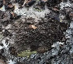 The species regularly produces reproductive structures (apothecia), which can grow up to 5 mm in diameter. These disc-like structures start concave when young but flatten or become convex as they mature, maintaining a dark brown colour and glossy appearance. Their edges are notably warty and irregular, featuring the same tiny pores (pseudocyphellae) found on the main body. The lichen lacks both soredia and isidia, which are alternative reproductive structures common in other lichen species.[16] Within the apothecia, which are constricted at their base, are microscopic spore-producing structures. The species also commonly produces pycnidia that are immersed in the lobes and release dumbbell-shaped conidia measuring 3.5–5.5 μm in length.[14]
