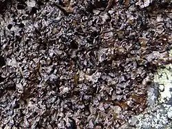 Melanelia stygia, the alpine camouflage lichen, is a species of lichen in the family Parmeliaceae.[6] The dark-coloured lichen, first described by Carl Linnaeus in 1753, forms leafy growths on rocks in arctic and alpine regions throughout the Northern Hemisphere. The lichen has a dark brown to black, glossy surface with narrow, overlapping lobes and tiny pores called pseudocyphellae scattered across its surface. It is a slow-growing species well-adapted to harsh mountain environments, where it is commonly found on non-calcareous rocks at high elevations. While it tolerates extreme cold conditions, climate change may pose a threat to its survival. The species can be used to produce a brownish-coloured wool dye.