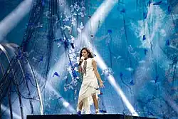 Her entry's title, "Marte", and a preview of the song were released to the public on 20 September 2019.[6] The song, written and produced by Pablo Mora alongside Manu Chalud, was released in full on 4 October 2019.[7] She was accompanied on stage by Idurne Rodriguez, Yara Díez, Violeta Leal, and María Mihali.[8] The scenography of the stage was made by Santiago Junegos. At the contest in Gliwice Arena, Poland, she placed 3rd with 212 points.