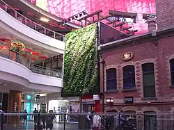 A vertical garden was installed on the side of the Coop's Shot Tower as part of the Melbourne International Design Festival in July 2008. Pioneered by internationally renowned French artist and scientist, Patrick Blanc, the garden had no soil and was attached to the wall using PVC plastic.[62] However, the running cost proved expensive and in 2013 it was replaced with an advertising billboard.[63]