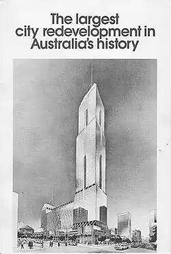 Originally termed the 'Victoria Project',[9] large scale redevelopment of the city block bounded by Lonsdale, Swanston, La Trobe and Elizabeth Streets was studied in some detail during the 1960s and 1970s, being closely linked with work on the City Loop Early work on the site commenced in 1971 when land on the south side of La Trobe Street was acquired, to enable the cut and cover construction of Museum Station (now known as Melbourne Central). With planning for the site being carried out by the Melbourne Underground Rail Loop Authority from 1980, the railway station opened in 1981, but protracted negotiations failed to find an anchor tenant for the development, resulting in the State Government of Victoria deciding in 1983 that a private developer should be sought.[6]