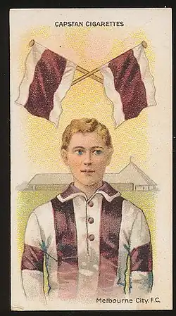 Finally, for the 1912 season, the Melbourne City Football Club was established as the inner-city club after the Preston Football Club left the VFA. The club was based at the East Melbourne Cricket Ground, after having also considered the Friendly Societies' Ground (the site of present day Olympic Park) as a home venue.[2] The club wore a dark red coloured guernsey (described as "claret" in contemporary sources) with white shoulders.[3]