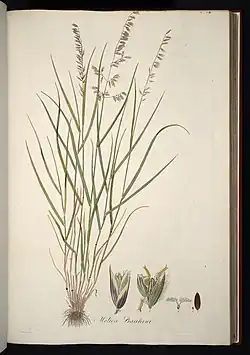 Glumes are reaching the apex of florets and are thinner than lemma. Lemma margins are ciliate and hairy on the bottom with obtuse apex. It has 2-veined palea with ciliolated keels. The sterile florets are barren, oblong, grow in clump of 2–3, and are 1.5 millimetres (0.059 in) long. The lower glume is ovate, is 6–8 millimetres (0.24–0.31 in) long and is 0.7–0.8 millimetres (0.028–0.031 in) longer than upper glume. The upper glume is as ovate as the lower one and is 8–10 millimetres (0.31–0.39 in) long. Both glumes are membranous, are purple in colour, have no keels, and are 5-veined. The apex of the upper glume is either acute or acuminate. Flowers have 3 stamens. Fruits are caryopses with an added pericarp and linear hilum.[1]