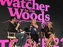 Hart (center) with her mother (right) and moderator Damian Holbrook (left) promoting The Watcher in the Woods at the 2017 New York Comic Con