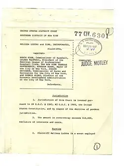 17. ^ "Complaint: Melissa Ludtke and Time, Incorporated" (PDF). Melissa Ludtke and Time, Incorporated v. Bowie Kuhn, Commissioner of Baseball, et al. No. 7329663 / Civil Case No. 77C6301. National Archives and Records Administration. U.S. District Court for the Eastern District of New York. 1865-. Record Group 21: Records of District Courts of the United States, 1685 - 2009. December 29, 1977.