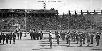The contract between Parsons and the university required the stadium to be ready for the upcoming 1923 season, reflecting assurances made by the Memorial Association during fundraising. Parsons' employment of university students and prospective football players during construction was applauded by NU chancellor Samuel Avery.[7] Work continued through a rainy summer and an August tornado, and was mostly complete in time for Nebraska's first home game, though lead builder Earl Hawkins insisted fans not be allowed into the unfinished upper sections.[8] On October 13, Nebraska defeated Oklahoma 24–0 in the first game at the new stadium; it was played on dirt as the grass field had yet to be installed.[a][10] The venue was formally dedicated a week later as "Memorial Stadium" to honor Nebraskans who served in the American Civil War, the Spanish–American War, and World War I.[b]