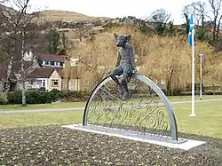 Fox Boy, a work by the sculptor Andy Scott, stands in the centre of Menstrie in Midtown Gardens (now named the "Nova Scotia Gardens" to commemorate the village's historical connection). The sculpture combines references to the water wheels that once powered industry in Menstrie, a pet fox kept by a Menstrie child years ago,[31] and the buzzards that frequent the skies over the village. Midtown Gardens flies the flag of Nova Scotia highlighting its role with the settlement and development of Nova Scotia.