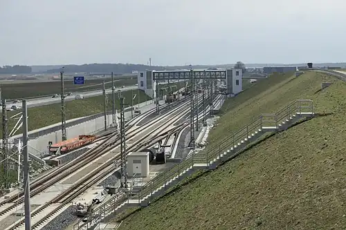 The tracks for the trains passing through are located on the inside, the platform tracks on the outside.[6] They have a length of 600 meters.[7] The entire station has a ballastless track, and ETCS Level 2 is used as the train protection system without conventional signals. Between the four entry signals there are eight exit signals (as ETCS Stop Marker) and three block indicators. The system is controlled by the Merklingen train dispatcher from the Neckartal computer-based interlocking sub-center.[4]