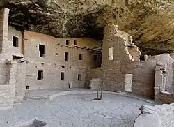 While much of the construction in these sites is consistent with common Pueblo architectural forms, including kivas, towers, and pit-houses, the space constrictions of these alcoves necessitated what seems to have been a far denser concentration of their populations. Mug House, a typical cliff dwelling of the period, was home to around 100 people who shared 94 small rooms and eight kivas built against each other and sharing many of their walls; builders in these areas maximized space in any way they could, with no areas considered off-limits to construction.[41]