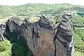 | Ypsilotera Monastery / Kalligrafon | Mones Ypseloteras / Kalligrafon | Μονής Υψηλωτέρας / Καλλιγράφων | The monastery was famous for its manuscripts and calligraphers. Founded in 1347 by Paschalis of Kalambaka. Ruins (39°43′30″N 21°37′40″E / 39.725090°N 21.627798°E) located on Ypsilotera Rock (585.7 m[26]) next to the "Devil's Tower", a geological rock formation that is between the Monastery of St. Nicholas Anapausas and Monastery of Varlaam. In the photo to the right, Ypsilotera is the free-standing dome-shaped rock on the left, covered with vegetation on top. | |