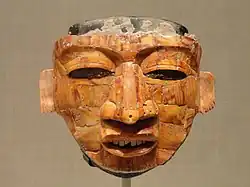The use of masks and costumes was an important part of Mesoamerican cultures for long before the arrival of the Spanish. Evidence of masks made with bone thousands of years old have been found at Tequixquiac, State of Mexico.[1] The uses of these masks were varied but always connected to ceremony and ritual, especially in theatrical dance and processions.[2] High priests used masks to incarnate deities.[2][3] Jaguar and eagle warriors dressed themselves like these animals in order to gain their strengths.[2][4] Funeral masks were reserved for the burials of the very elite such as that of King Pakal and were works of art, made of jade, shell, obsidian, hematite and other precious materials of the time.[5] Masks used in theatrical performances and dances varied widely: from depictions of the various animals of the Mesoamerican world, to images of old men and women generally for comedic relief, to designs that made fun of neighboring ethnic groups.[2]