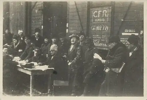 Together with Wilhelm Fischer, Benvenisti continued to organize the relief effort for Jewish deportees in Transnistria: "I was the one providing exact instructions for the HeHalutz personnel who went on illegal trips into Transnistria to provide aid and to attempt the rescue of people wherever this was feasible."[134] However, "once my persecution by Richter became more acute, I was removed from the assistance commission, on his express order. [...] Thanks to the continuous interventions I made with the Central [Jewish Office], Zionist representatives were finally accepted on the commissions that had left for Transnistria, which were presided upon by Mr Fred Șaraga."[135] By February 1944, Benvenisti, Moscovici and Iancu Scarlat were facing prosecution for an alleged participation in forging papers that exempted Isac Juman and other Jews from their labor duties.[136]