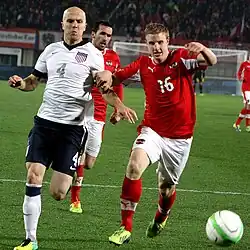 Bradley was a key player for the U.S. at the 2010 World Cup in South Africa, starting all four matches in central midfield. In the group stage, he scored the equalizer in a comeback 2–2 draw against Slovenia.[52] He captained the national team for the first time in an August 10, 2010 friendly against Brazil, played in his birthplace of New Jersey. At the 2011 Gold Cup, Bradley featured in each game, forming a new midfield partnership with Jermaine Jones, and scored the opening goal in the final against Mexico, though the Americans went on to lose 4–2.[53]