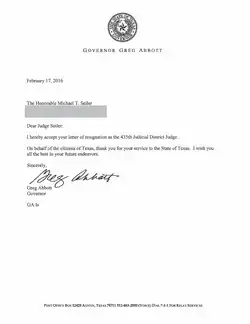 Resignation acceptance letter from Governor Abbott