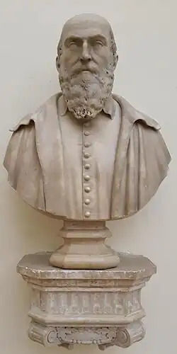 Among the painters who most benefited from the relationship with Sanmicheli were Francesco Torbido, Battista del Moro, Giovanni Battista Zelotti, and Paolo Veronese,[note 13] the latter one of the most important exponents of Venetian painting at that time, although Vasari was also recommended for some works, in particular for the creation of nine panels for one of the ceilings of the Corner Spinelli Palace.[note 14][31] Although many of the sculptural works needed for his projects were done by Sanmicheli himself, he commissioned some from other sculptors, especially Alessandro Vittoria, Pietro da Salò, and Danese Cattaneo.[32]