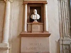 It would be necessary to wait well beyond the beginning of the 18th century with Bartolomeo dal Pozzo through his work Le vite de' pittori, de gli scultori et architetti veronesi, and especially with Scipione Maffei and his Verona illustrata, for interest in Sanmicheli's work to be rediscovered.[36] This renewed interest is also found later in the studies and works of Alessandro Pompei,[note 18] as well as in Adriano Cristofali and Luigi Trezza.[36] In the nineteenth century, there were additional Veronese architects and scholars who dealt with his work, such as Michelangelo Castellazzi, who designed Palazzo Ottolini (in Piazza Bra) modeling it on the structure of Palazzo Canossa, and Bartolomeo Giuliari, who in 1816 produced a monograph on Pellegrini Chapel.[37] In 1823, Francesco Ronzani and Girolamo Luciolli finally produced a meticulous collection of Sanmicheli's works.[38]