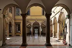 His fame as an architect is linked not only to works of a military character but also to civil architecture in the Renaissance style. In 1530 Ludovico di Canossa, a bishop of Bayeux who had returned to Verona during the 1520s, commissioned him to design a town house near Castelvecchio, between Porta Borsari and the Gavi Arch,[note 9] and a country villa in Grezzano of Mozzecane. Palazzo Canossa was completed shortly after the bishop's death in 1532; among other things, the architect, precisely through Ludovico, got to know the brothers Giovan Francesco, Antonio and Gregorio Bevilacqua, who entrusted him in the late 1520s with the construction of Palazzo Bevilacqua, which faced the Canossa Palace along what is now Corso Cavour, and the restoration of Bevilacqua Castle in 1532.[18]