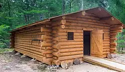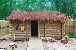 Michigan had around 32,000 people in 1830.[30] These early settlers often built log cabins on account of the abundant Michigan forests. This Settlers Cabin is typical of a simple 1- or 1+1⁄2-story structure that was built in the mid-19th century. They were usually constructed with round rather than hewn, or hand-worked, logs, and were constructed quickly for frontier shelter.[19][31]