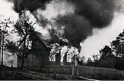 During World War II, the inhabitants of Michniów actively cooperated with the Polish resistance movement, in particular with the Świętokrzyskie Home Army units commanded by lieutenant Jan Piwnik, pseudonym "Ponury" ("Grim"), a cichociemny ("Silent Unseen" special-operations paratroopers of the Polish Army in exile in SOE).[2] On July 12, 1943, a German military unit partially burned the village and murdered over 100 inhabitants. In retaliation that same night, Piwnik's partisans attacked the express train Kraków-Warsaw in the area of Podłazie, Skarżysko County, killing or injuring at least a dozen Germans. The next day, German Ordnungspolizei returned to Michniów, completely burning the village and murdering almost all Poles who lived there. In total, at least 204 people,[3][4] including men (mostly burned alive),[5] 54 women and 48 children,[6][7] as many as ten of them were less than 10 years old,[8] were victims of the massacres in Michniów. The youngest victim was a nine-day-old Stefanek Dąbrowa, thrown by a German military policeman into a burning barn.[9] Occupational authorities forbade the reconstruction of the village and cultivation of surrounding fields. After the war, the Michniów massacre became a symbol of German crimes committed in Polish villages. Currently in Michniów there is the Mausoleum of Polish Rural Martyrology.[10]
