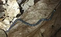 Annellated coral snake. In Spanish: coral anilada, naca-naca. Portuguese: cobra-coral anelada.[2]