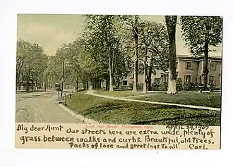 ![]() From a 1907 postcard: "Our streets here are extra wide, plenty of grass between walks and curbs. Beautiful old trees. Packs of love and greetings to all, Carl" | |