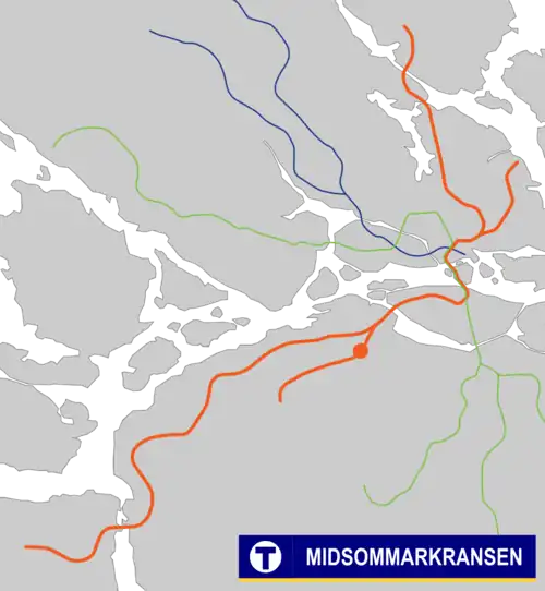 Midsommarkransen metro station is a station on the red line of the Stockholm metro, located in the district of Midsommarkransen. The station was opened on 5 April 1964 as part of the first stretch of the Red line, between T-Centralen and Fruängen.[2] The distance to Slussen is 4.6 km (2.9 mi). This is the last underground station in line 14 heading in the west direction.