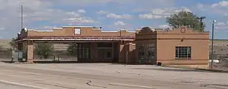 The service station, built in 1938, consists of two buildings. The main one has a 33 feet (10 m) girder-supported canopy over gas pump islands. It has a stepped brick parapet above the canopy. As of 2004, it hosted a store area and a leased post office; the latter space was formerly the Kenna Bank & Trust Company and still includes a bank vault with a Mosler Safe Co. safe.[3]