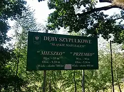 The names of the two prominent oaks, Mieszko and Przemko, were officially assigned in 2005 by the Silesian Voivode.[10] The names commemorate historical rulers of the region – Mieszko I, who lived at the turn of the 13th and 14th centuries, and Przemysław II, who reigned during the 15th century.[10]
