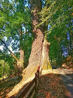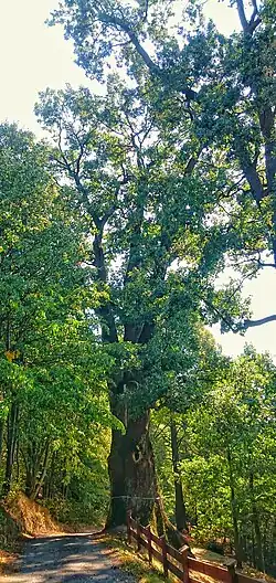 Mieszko Oak (Polish: Dąb Mieszko) is a monumental pedunculate oak growing in Kończyce Wielkie, in Gmina Hażlach, Cieszyn County, Poland. It is one of a pair of impressive oaks – next to it stands a smaller oak named Przemko Oak.[1] The trees are located on Dolna Street, 25 meters from the palace park in Kończyce Wielkie. The oaks are situated on a hill called Karłowski Kopiec, which descends to the nearby small river, Petrůvka.[2] The tree, with a circumference of over 8.5 meters, has a long history of protection, having been legally protected for the first time in 1935, with the current legal basis for its protection being the 2005 regulation of the Silesian voivode.