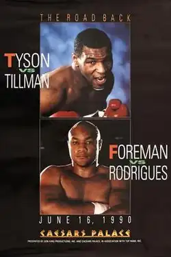 In his previous fight, Mike Tyson had lost his undisputed heavyweight title after being knocked out in the tenth round by 42–1 underdog James "Buster" Douglas in one of the biggest upsets in sports history. After a failed protest, Tyson's promoter Don King attempted to quickly gain a rematch with Douglas, but Douglas turned down King's offer and instead chose to face the number one contender Evander Holyfield.[2] Left with little choice, Tyson was forced down the comeback trail. Former welterweight and middleweight champion Thomas Hearns[3] and former heavyweight contender Renaldo Snipes[4] emerged as possible opponents for Tyson, but it was announced on May 1 that Tyson would face 1984 Olympic Gold Medalist Henry Tillman, who had twice defeated Tyson as an amateur, effectively costing Tyson a spot on the U.S. Olympic team.[5] In spite of his successful amateur career, Tillman's professional career was unimpressive, facing mostly unknowns and losing his only high-profile fight to Evander Holyfield by way of knockout. Tillman entered the fight as a 25–1 underdog and was given virtually no chance of defeating Tyson. The Tyson–Tillman fight was the second fight of a doubleheader event that also featured George Foreman taking on Adilson Rodrigues.